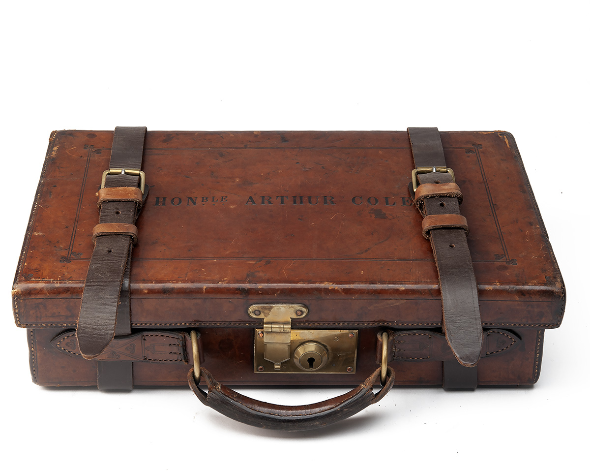 for approx. 250 cartridges, the lid interior lined with red baize with a James Purdey & Sons trade label, the body lined with beige canvas with four fixed dividers, brass lock (key missing), the lid exterior with 'HONBLE ARTHUR COLE'
