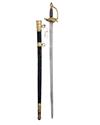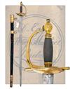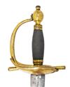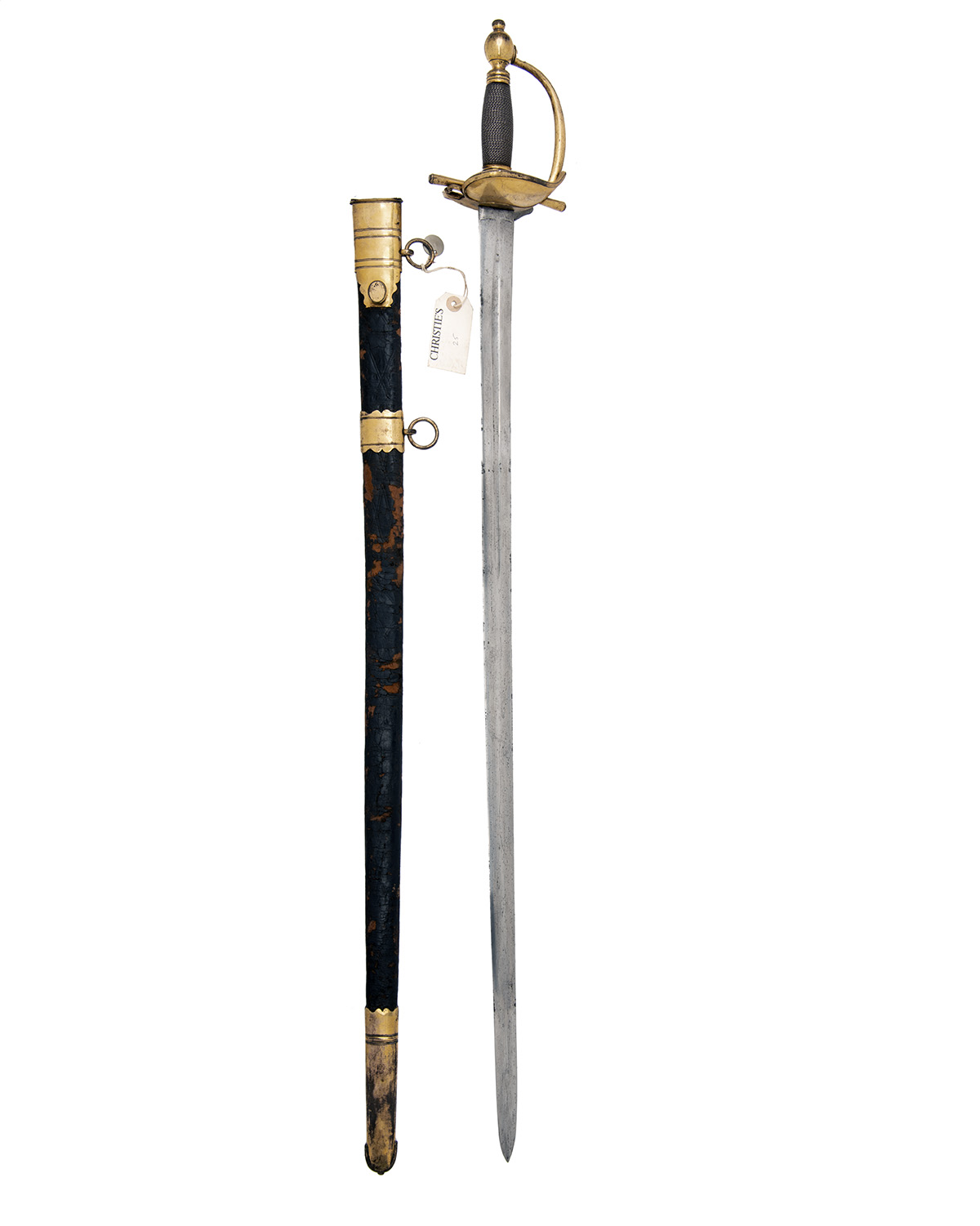 with straight 34in. double-edged blade, short blind fuller to both sides, typical gilded double boat shell guard, straight reverse taper quillions, gilded 'D' shaped knuckle-bow and gilded ovoid pommel with twisted silver wire bound grip, complete with its leather scabbard (leather distressed, stitching undone) fitted with gilded brass mounts, the throat signed within a circular borderline 'D. EGG, HAY MARKET LONDON' and bearing a collection medallion numbered '37'