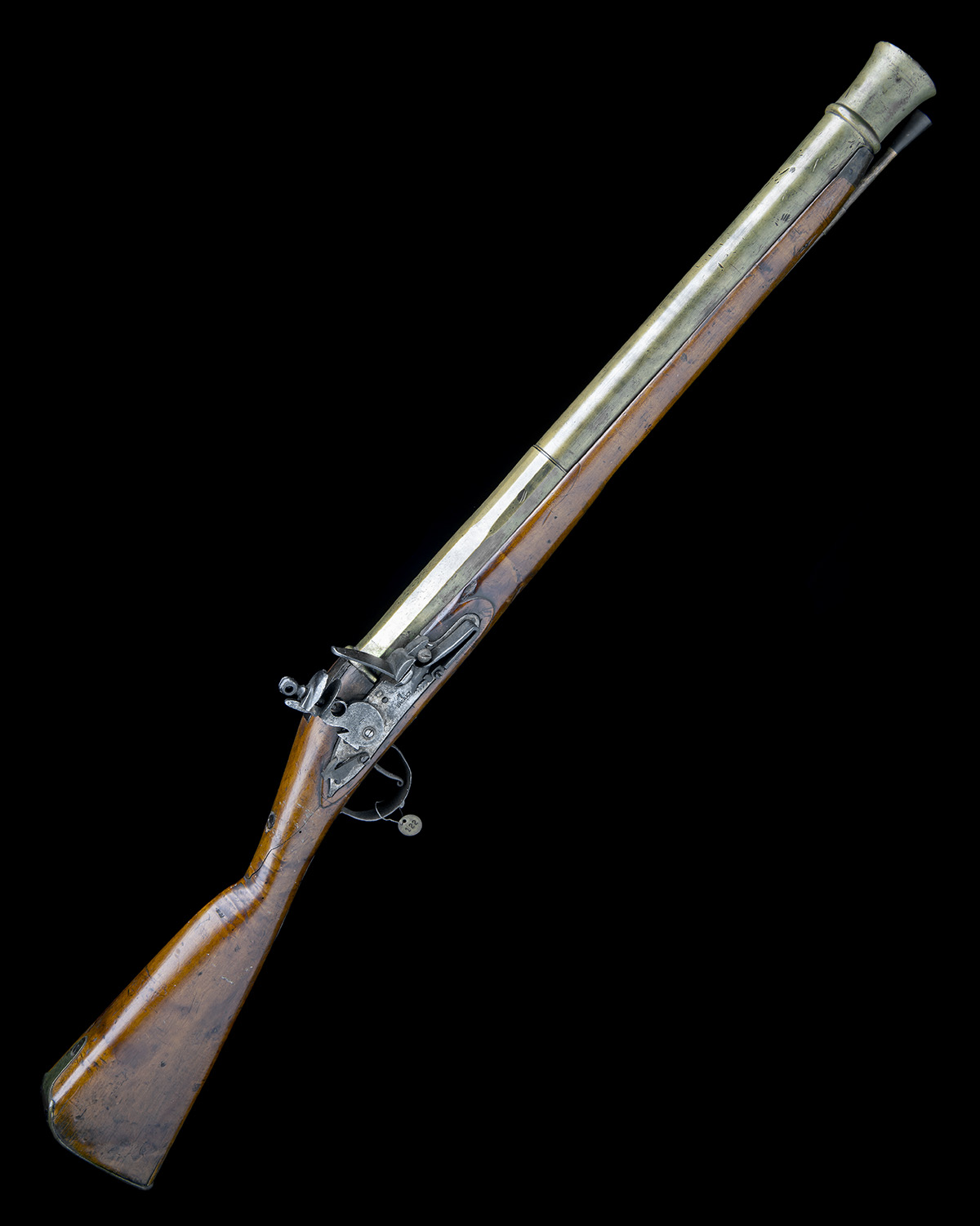 circa 1705, with heavy two-stage 24in. brass barrel with substantial banded cannon muzzle, London proofs and makers mark 'IS' below a star, the breech also with substantial moulded band, square ended iron top-tang fixed from below, slab-sided iron lock held by three substantial dome-headed side-nails and signed 'I. SHOREY', pointed tail, slab-sided ring-necked cock with floating 'dog-catch' behind, heavy walnut full-stock (replaced in antiquity, cracked and pegged at wrist), exposed muzzle, original sheet metal furniture pieces re-used and replacement ramrod, the trigger-guard bow retaining a sealed collection tag from an unknown collection numbered '122'