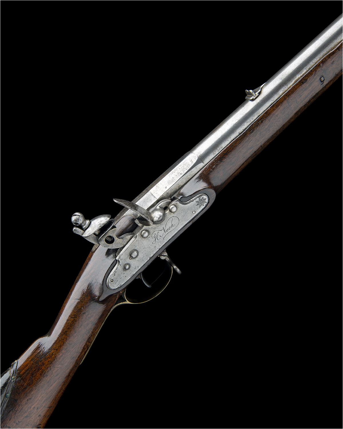 circa 1800, with octagonal to round 26in. barrel rifled in the Baker style, applied blade fore-sight, standing notch rear-sight on shaped foot, Baker style bayonet bar at muzzle, the top of the knock-off breech signed 'H. NOCK PATENT', special enclosed screwless lock signed in script 'H. NOCK', a starburst engraved over the retaining hook on the bar, walnut full-stock with brass furniture including patch-box to right hand side of butt, the spur of heel-plate engraved 'No 11', applied leather cheek-piece, stirrup swivels and split ramrod channel with pan-head iron ramrod