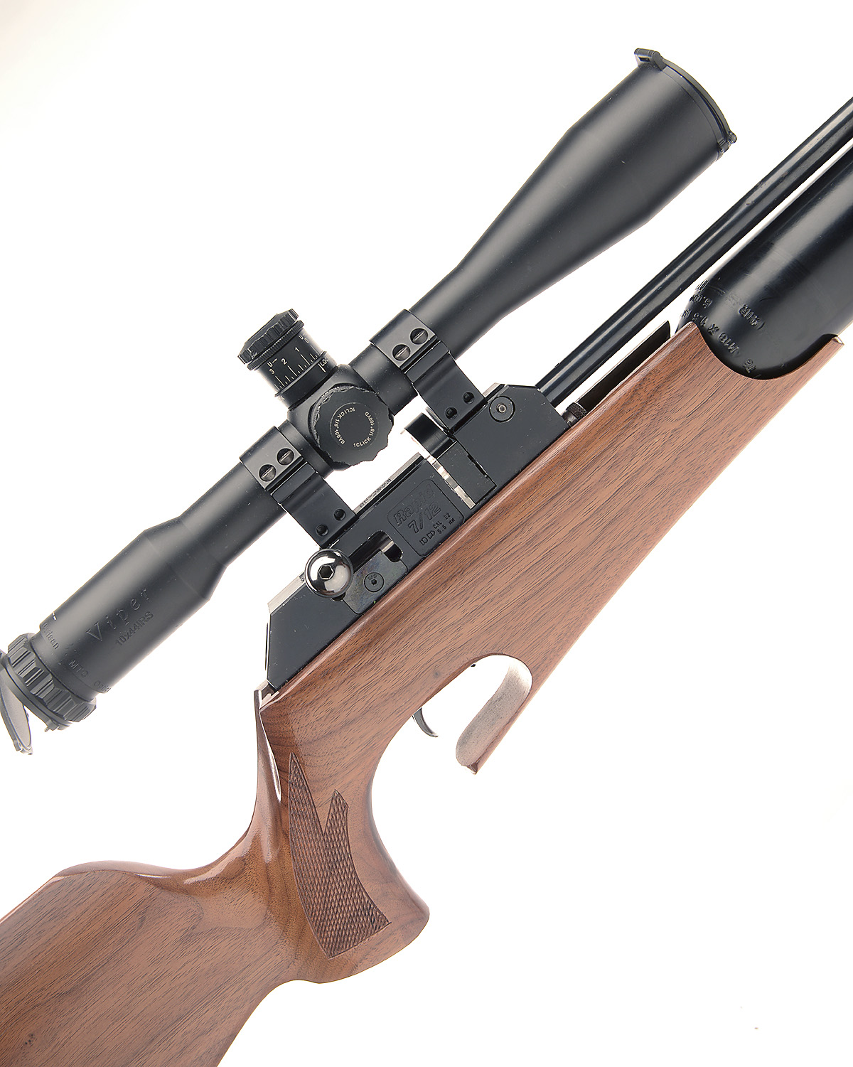 AN FAC-RATED .22 PRE-CHARGED PNEUMATIC REPEATING AIR-RIFLE SIGNED THEOBEN, MODEL 'RAPID 7/12', serial no. 007454, with 25 3/4in. barrel including detachable sound moderator, bolt action receiver with twelve shot magazine, walnut right hand half-stock and oversize air cylinder, tested, fitted with a Viper tactical 10x44 telescopic sight