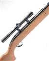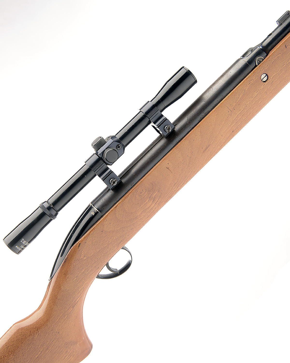 with 18 1/2in. barrel (rear-sight absent), metal tap handle, plain air-chamber and beech half-stock, fitted with a Tasco 4x20 telescopic sight and in a suede slip