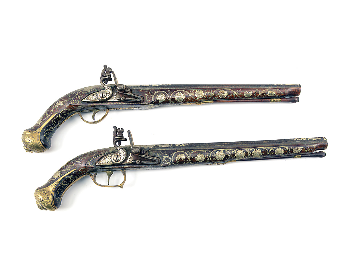 circa 1850, above average quality in the Turkish style with 13in. white metal decorated barrels, , white metal decorated locks and walnut full-stocks with applied wire scrolls and embossed brass furniture small losses to decoration