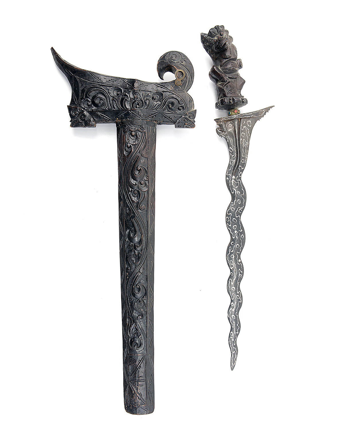 with 14 1/2in. wavy blade, wood hilt carved in the form of a bird god, imitation jewelled collar and fully carved scabbard