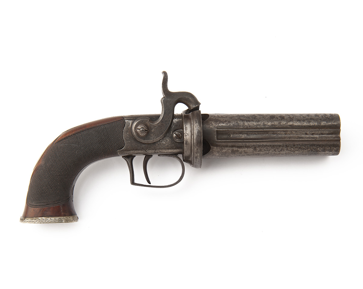 circa 1835, with moulded hand indexed four-shot squared 4in. barrel-group, carved flutes in imitation of side-ribs, full moulded nipple-guard, borderline and scroll engraved boxlock side-hammer action with guarded trigger, finely chequered pistol-grip butt with white metal escutcheon and engraved white-metal band around the base of pommel with further engraved escutcheon to the flat base