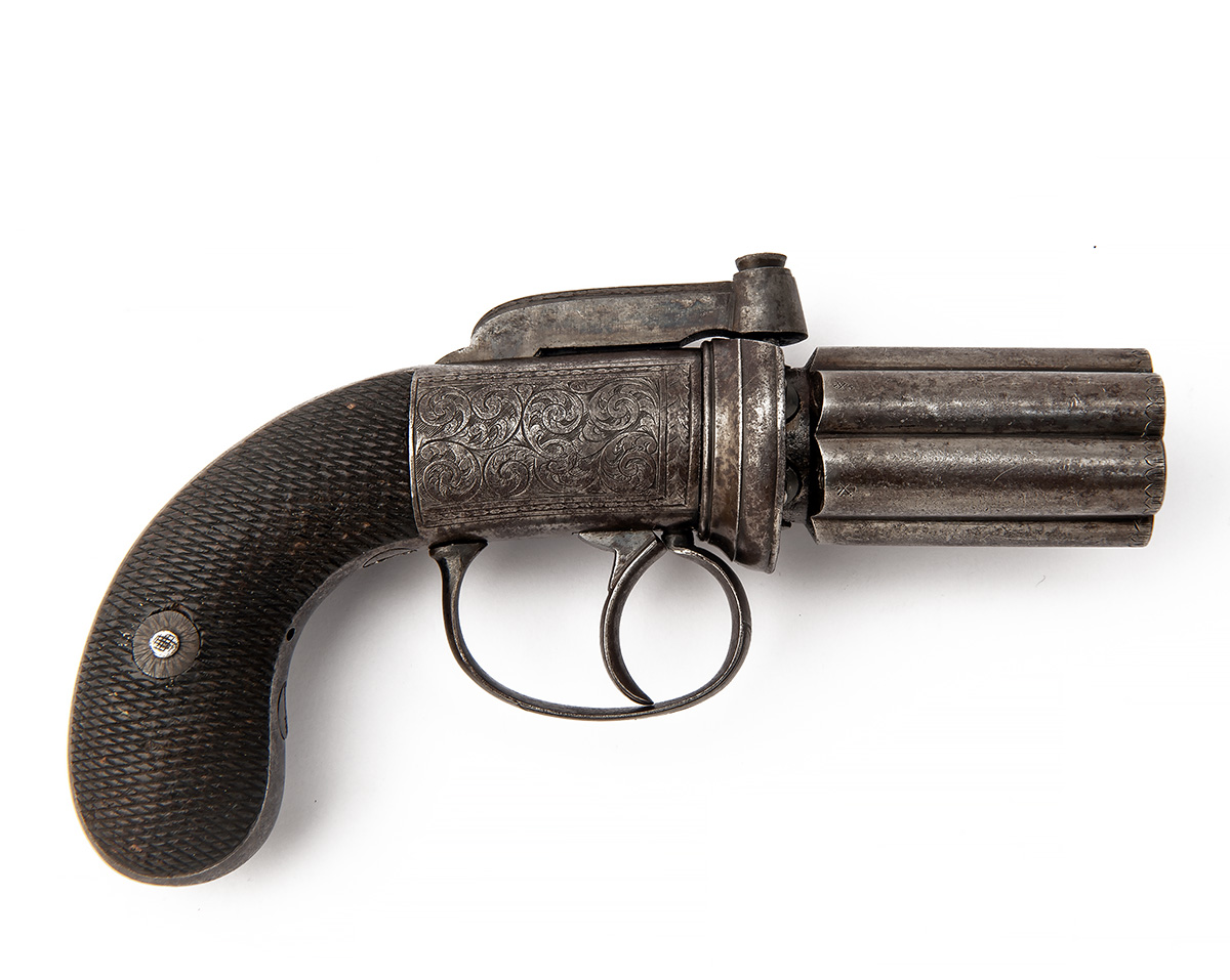 A 180-BORE PERCUSSION POCKET SIX-SHOT PEPPERBOX REVOLVER, UNSIGNED, no visible serial number,