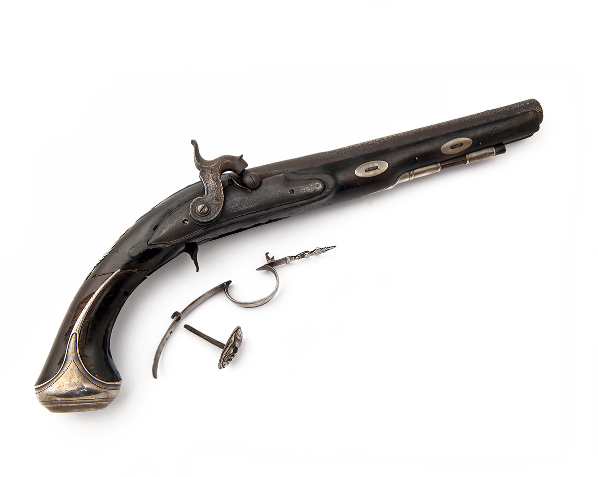 A 15-BORE PERCUSSION SILVER-MOUNTED HOLSTER-PISTOL FOR RESTORATION, no visible serial number,