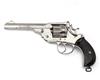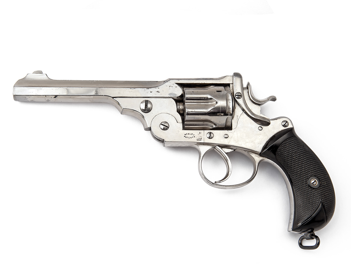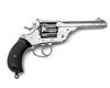 with nickel-plated 6in. barrel, blade fore-sight, the top of barrel signed 'ARMY & NAVY C.S.L.', the top-strap marked 'W.G. MODEL 1889', coin release nickel-plated cylinder with 'church window' flutes. break-open frame, black hard-rubber chequered birdshead grips, lanyard swivel at heel and guarded trigger, retaining virtually all its plated finish