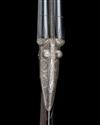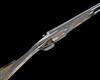 27 5/8in. (70cm) nitro monobloc barrels with sunken matt top rib and no under rib, scroll engraving at the breech end, 9 punch marks, 2 3/4in. chambers, bored approx. true cyl. choke in both, sprung sliding-breech with converging obturator discs, button barrel release, manual side safety, bouquet and scroll engraving with carved leaf fences, bright finish overall, 14 3/4in. stock including 1in. ventilated rubber recoil pad and original buttplate, fore-part with horn finial, weight 6lb. 4oz.