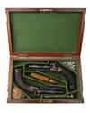 circa 1840, expertly restored and re-finished, with colour hardened 3 1/2in. side-by-side barrels, engraved bands at the muzzles, London proofs, engraved rib-end at breech, borderline and scroll engraved colour-hardened action with radiused edges and colour hardened engraved side-hammers, the top-tang signed 'ALEX'R THOMSON EDINBURGH', finely chequered walnut full-pistol butts with scalloped heads, flared heel and colour hardened iron caps with central trap-doors, blued trigger-guard bows and captive ramrods on blued under-ribs, in a period walnut box with side-catches converted for these pistols and relined and compartmented in green baize, complete with a lozenge bodied flask and scissors bullet mould