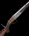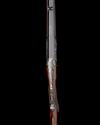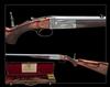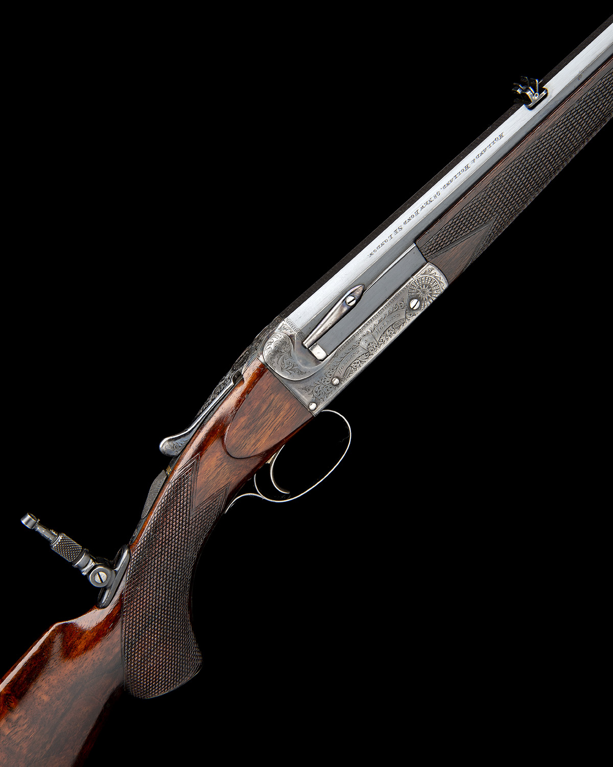 26in. octagonal barrel with matted sight flat, open rear sight with two folding leafs marked for 50, 100 and 150 yards with white metal inlaid sight lines, dove-tailed bead fore-sight, engraved 'HOLLAND & HOLLAND . 98 NEW BOND ST. LONDON. WINNERS OF ALL THE "FIELD" RIFLE TRIALS. .295 SEMI SMOOTH BORE.', the stock mounted with an adjustable folding peep-sight, non-selective ejector, automatic safety with gold-inlaid 'SAFE' detail, carved teardrop fences, removable striker disc, fine beaded border and acanthus scroll engraving, the makers name in an an ornate scrolling banner, retaining some colour-hardening and finish, 14 1/2in. figured pistolgrip stock including steel buttplate and engraved pistolgrip cap, cheekpiece, Hackett-type snap-on splinter fore-end with horn finial, weight 5lb. 8oz., in its makers leather case