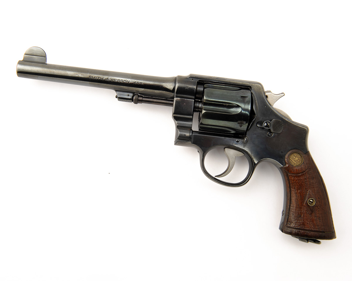A .455 SIX-SHOT SERVICE REVOLVER SIGNED SMITH & WESSON, MODEL MKII HAND EJECTOR', serial no. 59270, circa 1915, with reblued 6 1/2in. barrel, fluted swing-out cylinder, solid frame and walnut grips (chequering smoothed), refinished