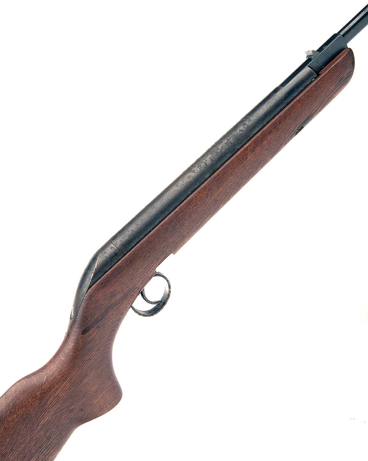 A .177 BREAK-BARREL AIR-RIFLE SIGNED BSA, MODEL 'CADET', serial no. BC22654, with 15in. sighted barrel, plain air-chamber (no visible etching) and beech half-stock, finish worn