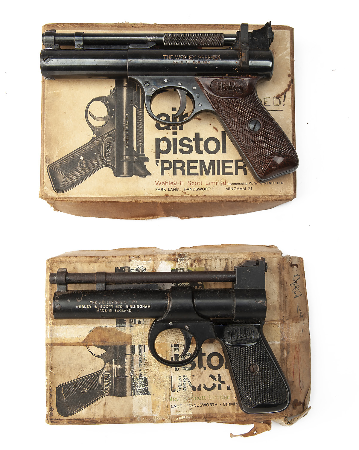 the first a post war Junior model, with blued 6in. .177 smoothbore barrel, black enamel finished air-chamber with make and model details filled out in white paint, adjustable sight, chequered black bakelite grips, appearing unused but with storage corrosion to barrel, box distressed, the second a post war .22 Premier model, with blued 6 1/2in. barrel (some marks), stirrup barrel latch, stepped blued air-chamber with model details in white paint, five pin trigger group with weight adjuster, brown chequered bakelite grips, appearing little used with some storage corrosion to extremities, box fair, with leaflet