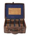 for approx. 200 cartridges, the interior lined with blue baize and blue canvas, a leather Army & Navy C.L.S. trade label, three removable dividers, four leather lifters, brass lock (key missing), the lid exterior with 'J.S.'