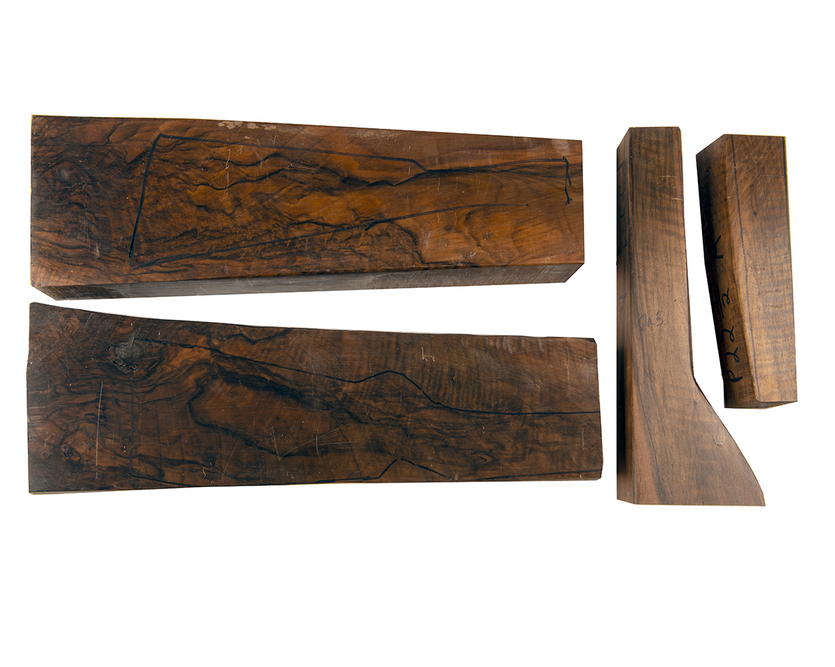 A PAIR OF EXHIBITION GRADE WELL-FIGURED WALNUT STOCK BLANKS AND FORE-END WOODS, 2 x stock blanks measuring approx. 22 1/2in. x 7in. x 3in., fore-end blanks measuring approx. 12in. x 3in. x 3in.