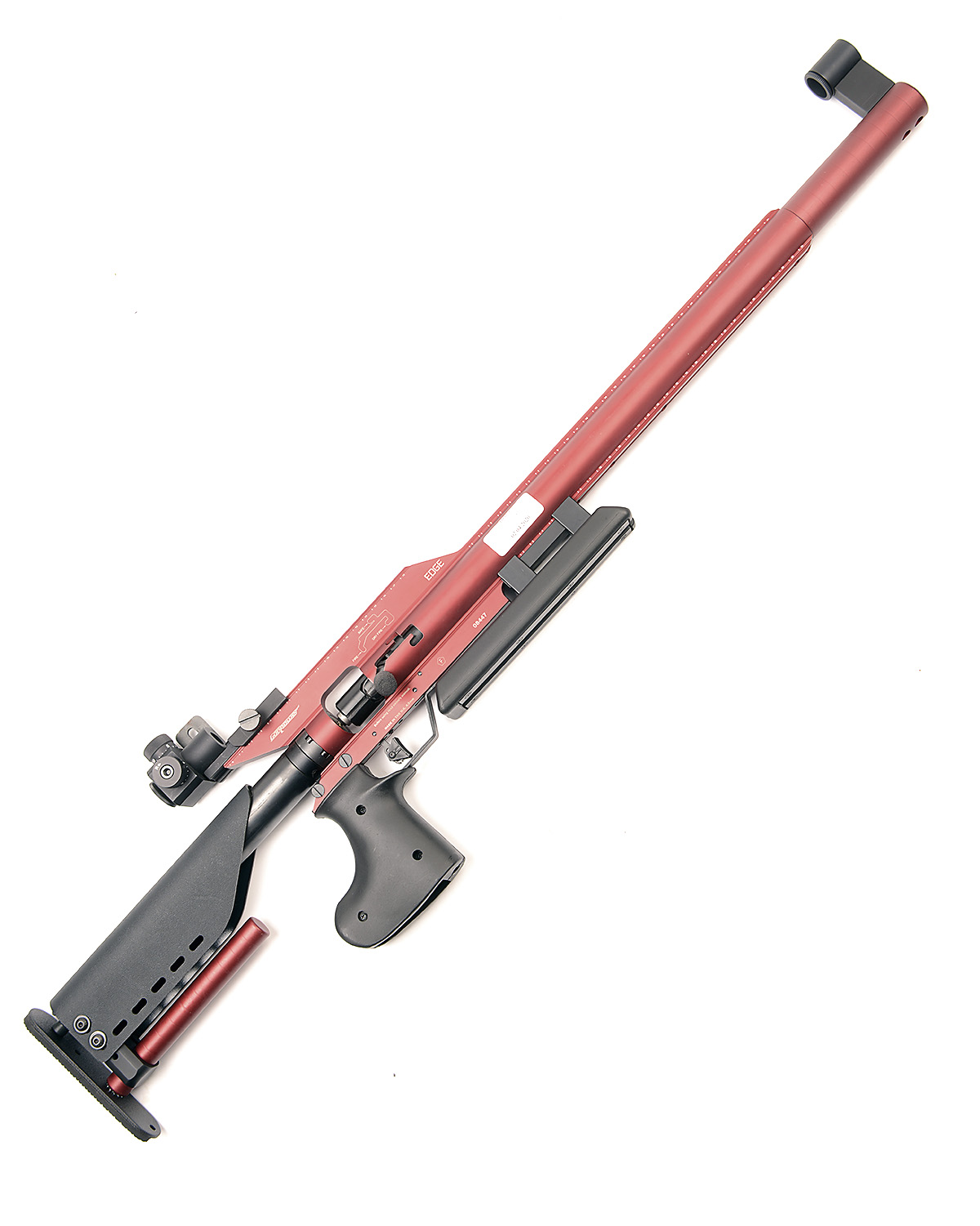 A CASED .177 PRE-CHARGED PNEUMATIC AIR-RIFLE SIGNED GUNPOWER, MODEL 'EDGE', serial no. 08447, with in-line 23in. moderated barrel finished in metallic satin rose, inline stock air-reservoir, bolt action breech, ambidextrous furniture and match open sights, in an abs plastic case appearing little used
