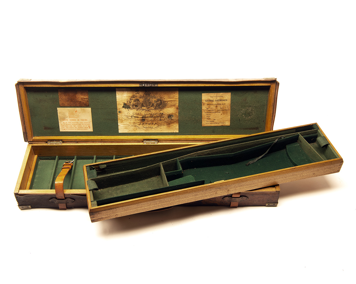 fitted for 30in. barrels, the interior lined with green baize, a Chas. Lancaster trade label, oak green baize-lined removable tray converted for single hammerless gun, the underside for cartridges, brass lock (including key)