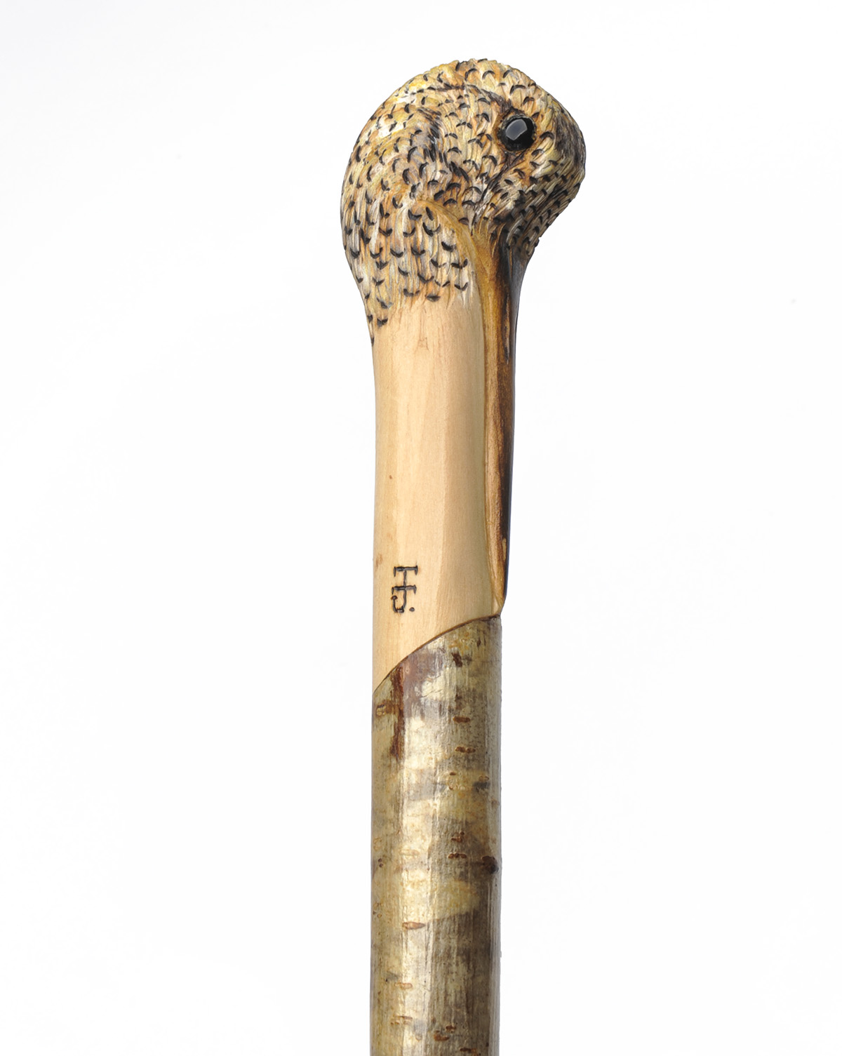 measuring approx. 46 1/2in. in length, with hard wood shaft, the top carved and painted in the form of a woodcock head, with magnetic ferrule