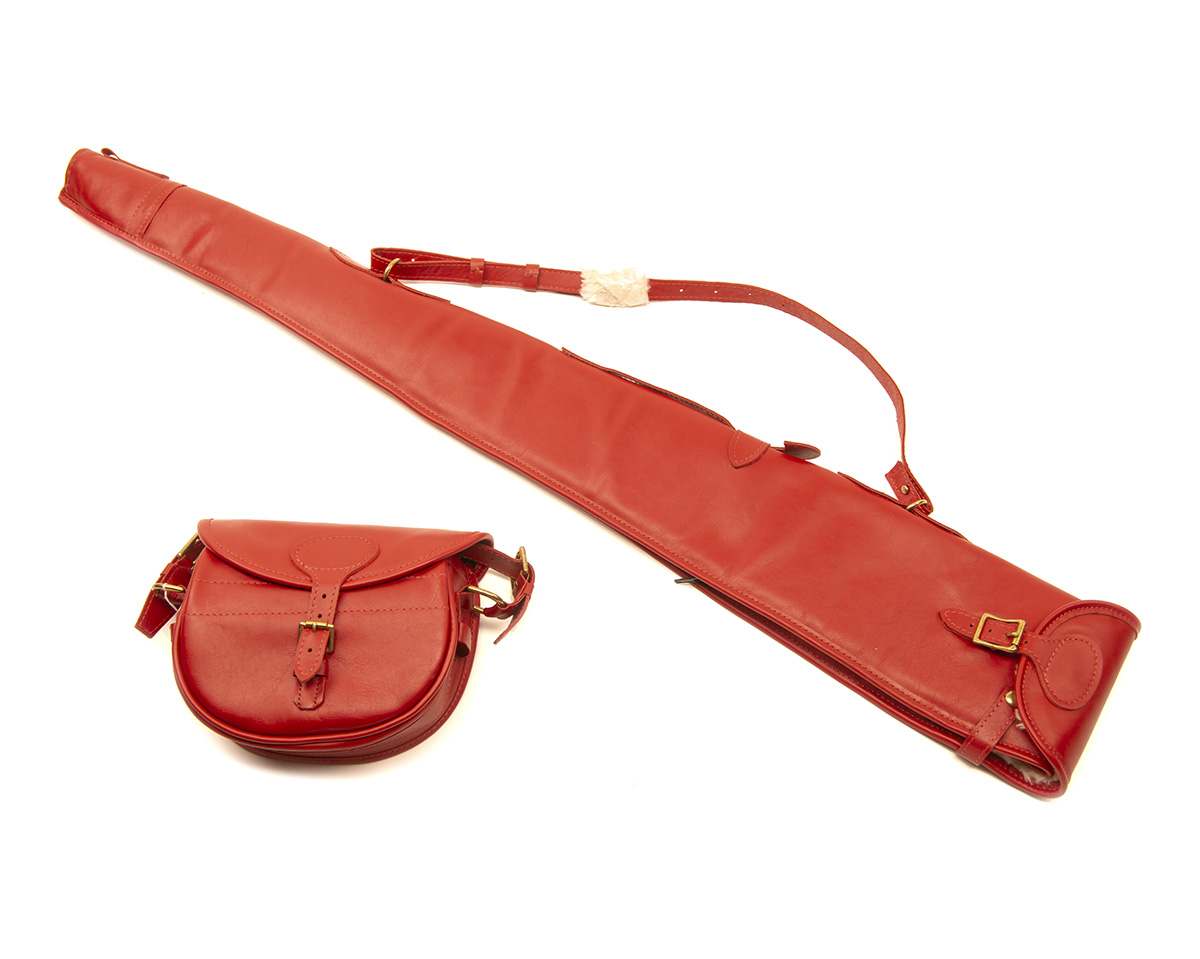 AN UNUSED RED LEATHER SINGLE GUNSLIP WITH MATCHING CARTRIDGE BAG,