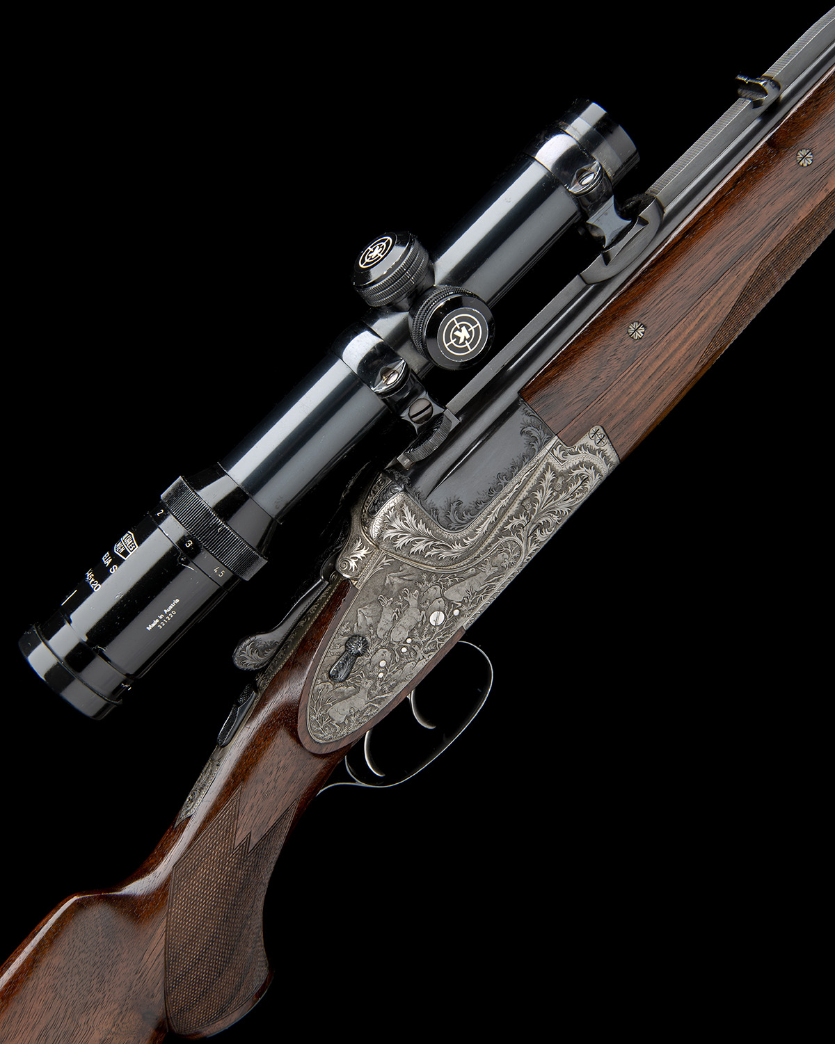 25in. nitro barrels with stepped raised solid matt top rib, open sights and ramped bead fore-sight, the breech end mounted with a Karl Kahles Helia S 1,1-4.5x20 telescopic sight, serial no. 321220, in quickly-detachable mounts, three-piece fore-end with wooden side fillets, bolstered action with hold-open toplever, manual safety, hand-detachable lockplates, cocking-indicators, set front trigger, the action and furniture carved in relief with thistle designs, the lockplates with game scenes of red deer and chamois, old silver and blued finish overall, 14 1/4in. pistolgrip stock with cheekpiece, pistolgrip-cap, sling swivels and including 1/2in rubber recoil pad, the stock inset with gold letters 'P F' toward the heel, weight 8lb. (unscoped) and 9lb. 2oz. (with scope)