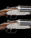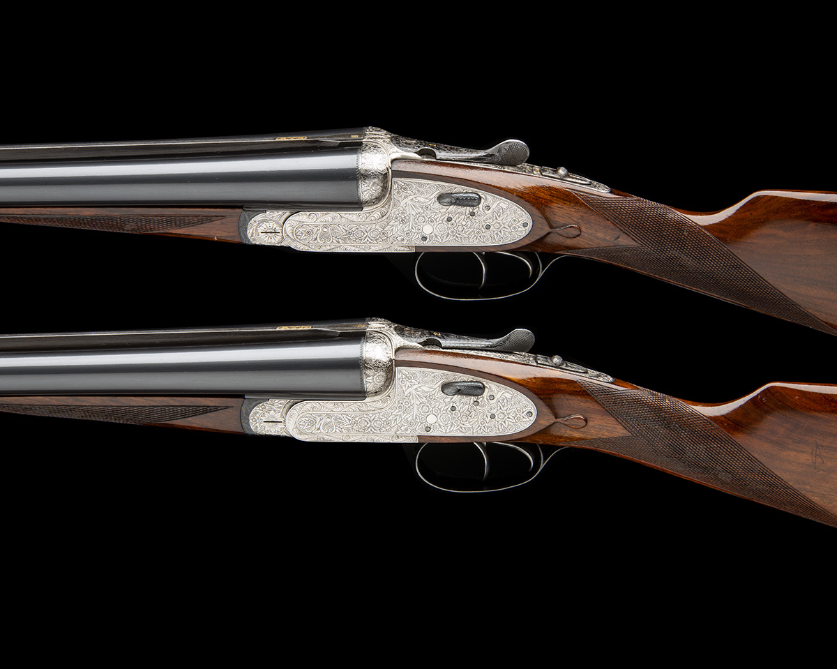 25in. nitro chopperlump barrels with matt Churchill-ribs gold-inlaid 'AYA' and '1' and '2', 2 3/4in. chambers, bored approx. imp. cyl. and 1/4 choke (No.1) imp. cyl. and 1/2 choke (No.2), toplevers gold-inlaid '1' and '2', automatic safeties with gold-inlaid 'S' details, removable striker discs, hand-detachable lockplates, gold-inlaid cocking-indicators, rolled-edge triggerguards, articulated front triggers, fully engraved with bold acanthus scrollwork and floral motifs, brushed bright finishes, 14 3/4in. stocks, weight 6lb. 7oz. (No.10 6lb. 6oz. (No.2), in a brass-cornered tan leather Brady double guncase