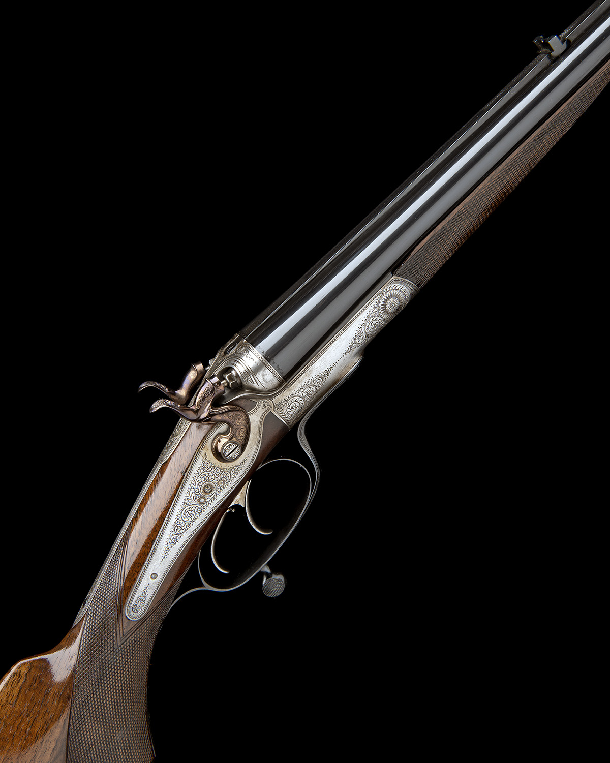 25 1/4in. black powder only barrels with raised file-cut rib, banner engraved 'NAGEL & MENZ K.K. HOFBUCHSENMACHER. STRASSBURG. BADEN.', open sights and bead fore-sight, carved percussion fences, rebounding back-action locks, set triggers, border and fine acanthus scroll engraving, brushed and reblued finish overall, 13 5/8in. figured pistolgrip stock (crack at right underhorn) with cheekpiece, engraved steel pistolgrip-cap, sling eyes, and steel buttplate, weight 6lb. 8oz.