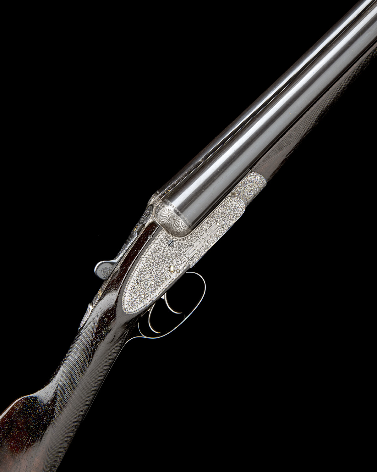 30in. nitro reproved barrels, the rib engraved 'HOLLAND & HOLLAND. 98. NEW BOND STREET. LONDON.' and gold-inlaid '3' at the breech end, 2 1/2in. chambers, bored approx. true and imp. cyl. choke, toplever gold-inlaid '3' and engraved 'PATENT EJECTOR', automatic safety with gold-inlaid 'SAFE' detail, gold-inlaid cocking-indicators, carved shell fences, best Royal scroll engraving, the lockplates with the makers name in elaborate cartouches, the underside with 'ROYAL HAMMERLESS EJECTOR', 14 1/2in. stock including buttplate, weight 6lb. 14oz., in its makers brass-cornered oak and leather case