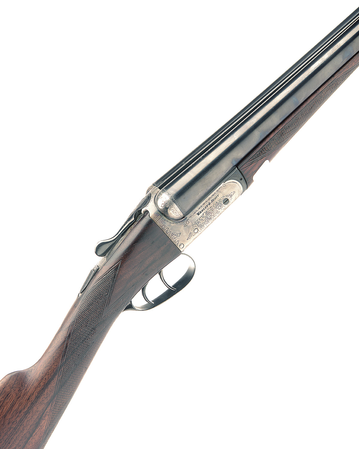 WEBLEY & SCOTT 12-BORE BOXLOCK EJECTOR, serial no. 146144, 26in. nitro barrels, 2 3/4in. chambers, bored approx. 1/4 and 1/2 choke, automatic safety, border and partial acanthus scroll engraving, retaining some original colour-hardening and finish, 15 1/2in. stock including 5/8in. wooden extension, weight 6lb. 7oz.