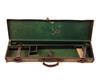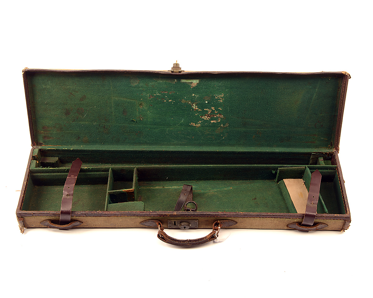 A CANVAS AND LEATHER SINGLE GUNCASE, fitted for 30in. barrels, the interior lined with green baize, brass lock (key missing)