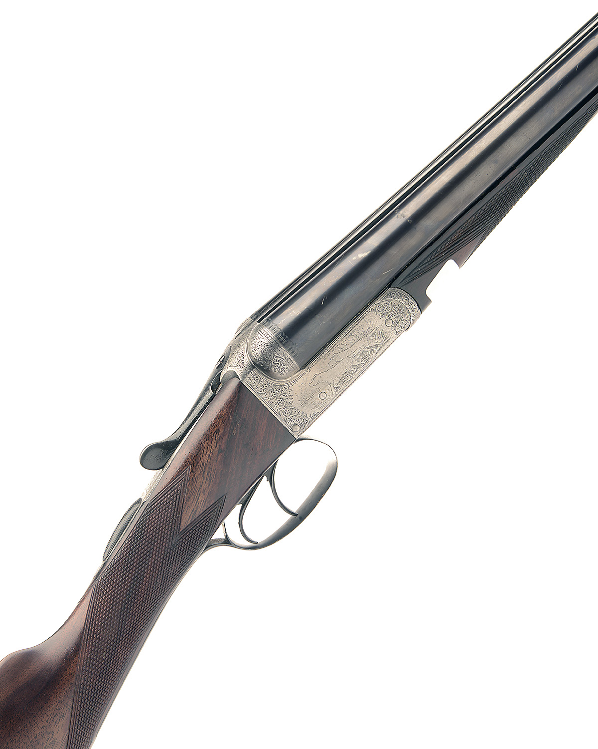 J. & W. TOLLEY 12-BORE BOXLOCK EJECTOR, n.v.s.n., 28in. sleeved nitro barrels, rib engraved 'J. & W. TOLLEY. 59. NEW BOND ST. LONDON.', 2 3/4in. chambers, bored approx. 1/4 and 3/4 choke, treble-grip action, automatic safety, beaded border and acanthus scroll engraving surrounding game scene vignettes, 14 1/2in. stock including buttplate