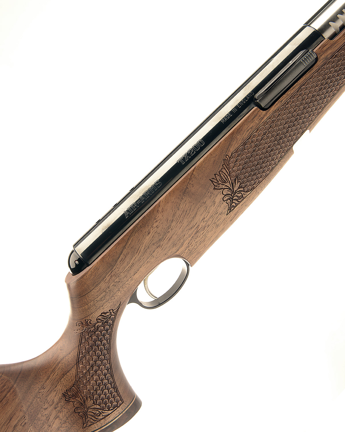 AN FAC-RATED .22 UNDER-LEVER AIR-RIFLE SIGNED AIR-ARMS, MODEL 'TX200', serial no. 141934, with blued 13 1/2in. barrel threaded for a sound moderator, sliding breech, blued air-chamber and walnut right hand three-quarter stock with laser cut fishscale chequering