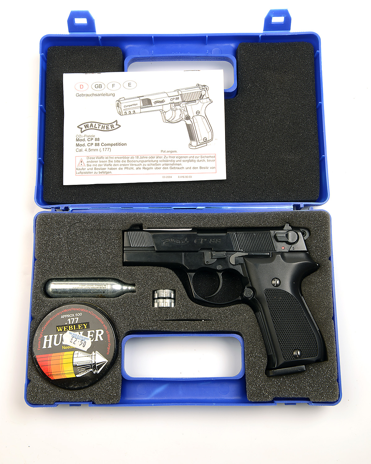 A CASED .177 CO2-POWERED REPEATING AIR-PISTOL SIGNED UMAREX, MODEL 'WALTHER CP88', serial no. A50424606, with blued 4in. barrel, blued receiver, chequered black plastic grips and complete in its maker's plastic carry case with gas, two magazines, instructions and pellets, untested