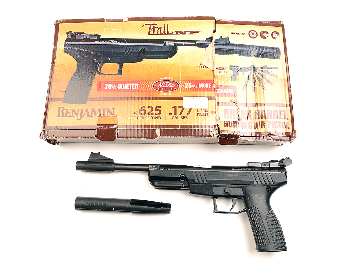 A BOXED .177 BREAK-BARREL AIR-PISTOL SIGNED BENJAMIN, MODEL 'TRAIL NP', serial no. 517X01746, with 8in. sighted barrel not including detachable cocking aid, blued air-chamber and abs black plastic receiver with integral grip, appearing little used in its derelict maker's carton