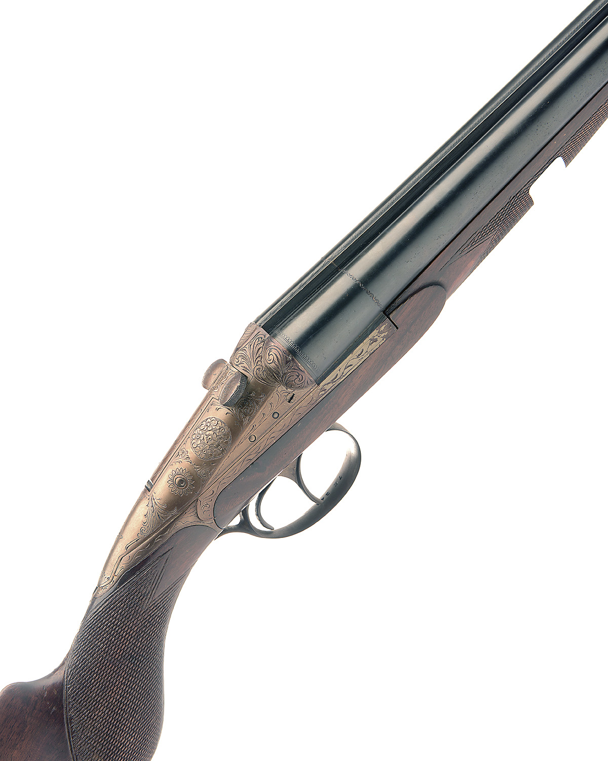 DARNE 12-BORE 'GRADE R13' SLIDING BREECH NON-EJECTOR, serial no. 7E348, 27 1/2in. nitro barrels with raised matt rib, no under rib, three punch marks, 2 3/4in. chambers, bored approx. 1/4 and 3/4 choke, manual two-step opening sliding breech, converging obturator discs, side mounted safety lever, floral and scroll engraving, 15 3/8in. semi-pistolgrip stock including leather covered (possible extension) and rubber recoil pad, weight 6lb. 10oz.