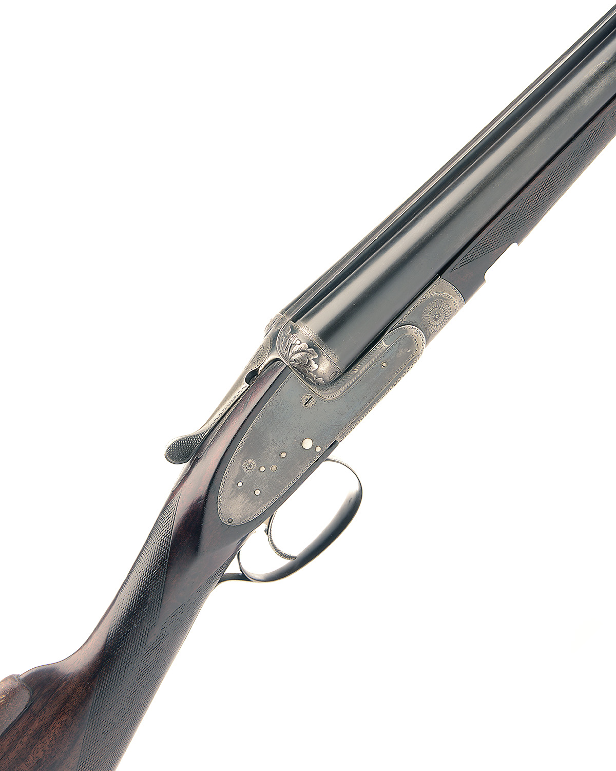 BELGIAN 12-BORE SINGLE-TRIGGER SIDELOCK EJECTOR LIVE PIGEON GUN, serial no. 4860, 28 1/4in. nitro barrels with raised matt rib (loose, pitting and general frosting), 2 3/4in. chambers, bored approx. 1/4 and 3/4 choke, bolstered treble-grip action with hidden third bite, removable striker discs, no safety, the fences carved with oak leaves, non-selective single-trigger, mechanism at fault, blacked action with border engraving, 14 1/4in. stock including ventilated rubber recoil pad, and 3/16in. wooden extension, with applied cork comb-raiser, stock covered with old live pigeon shooting event stickers, weight 6lb. 15oz.