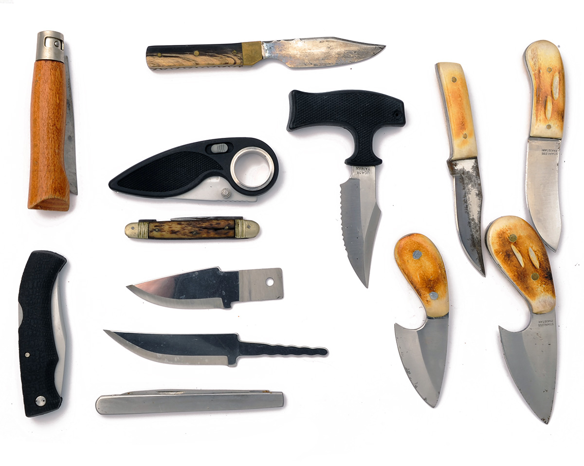 A COLLECTION OF ELEVEN KNIVES, TWO BLADES AND A LANSKY SHARPENING SET
