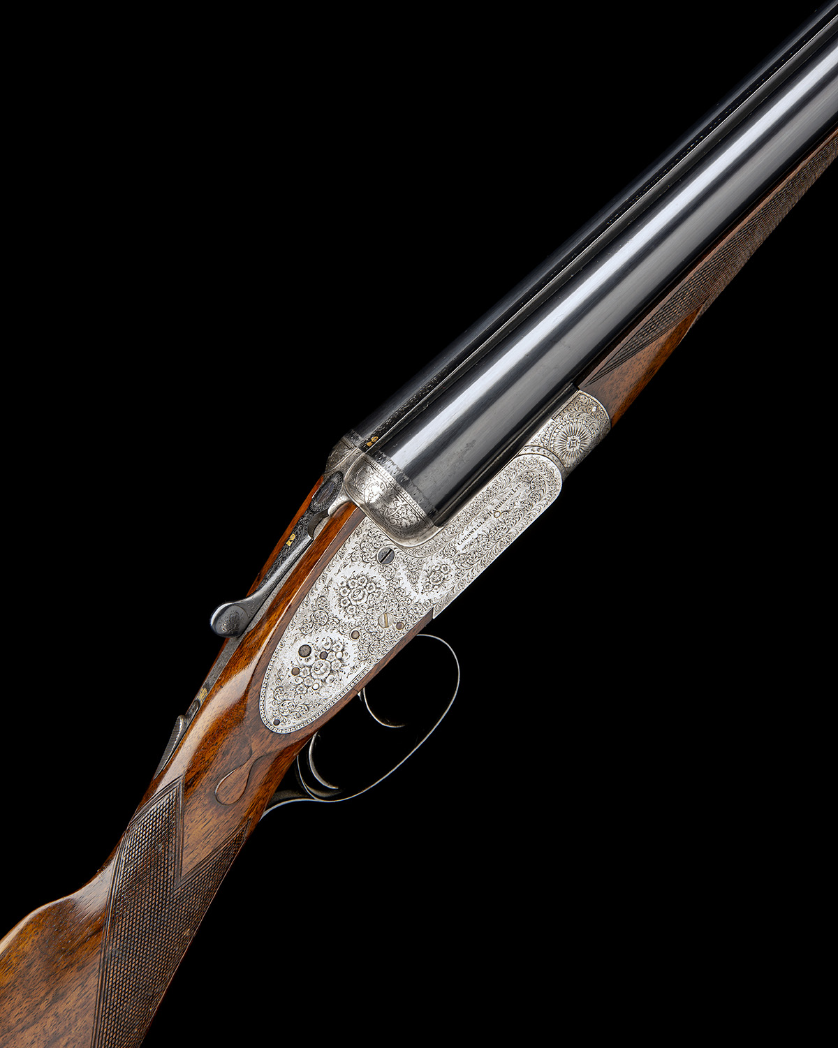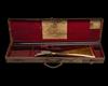 30in. nitro barrels, the rib engraved 'COGSWELL & HARRISON LTD. "EXTRA QUALITY VICTOR EJECTOR" 141. NEW BOND ST. LONDON.', and gold-inlaid '2' at the breech end, 2 1/2in. chambers, bored approx. true cyl. and 1/4 choke, toplever gold-inlaid '2', automatic safety with gold-inlaid 'SAFE' detail, gold-inlaid cocking-indicators, fine acanthus scroll engraving with floral bouquets and some beaded bordering, brushed bright and reblued finish overall, 14 7/8in. figured stock including 7/8in. rubber recoil pad, weight 7lb., in a leather case