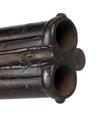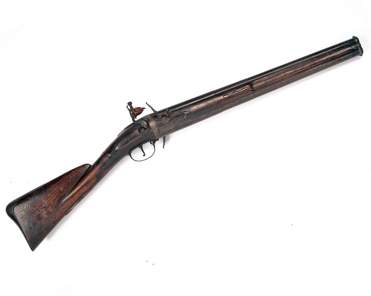 circa 1725, with round iron triple-staged barrel signed at breech 'IOHN HARMAN LONDINI', moulded bands to each intersection and at breech, applied moulded figure '8' barrel band at muzzle with two small fore-sights, matching engraved bands to both halves of the swivel-joint, the turnover released by squeezing the trigger guard bow at front pillar, slightly curved and radiused back-action lock with moulded border and signed 'IOHN HARMAN', the front half of lock with pan and frizzen mounted to the side of barrel with a second inverted on the opposite side, walnut handrail butt-stock with carved apron around the top-tang with tear-drop finial, iron furniture (some pitting) including moulded heel-plate with full-length top-spur and pierced side-plate, further tear-drops carved behind the lower tang, lock and sideplate, carved wood fillets to both sides of the barrels, one retaining a ramrod the other with false ramrod channel, both with carved tear-drop terminals