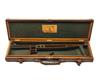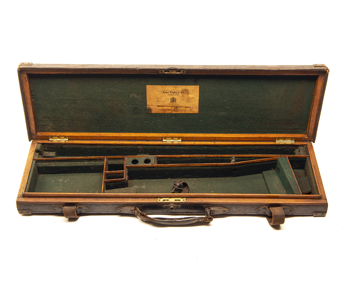 fitted for 30in. barrels, the interior lined with green baize, a John Rigby & Co. trade label, brass lock (key missing), handle broken