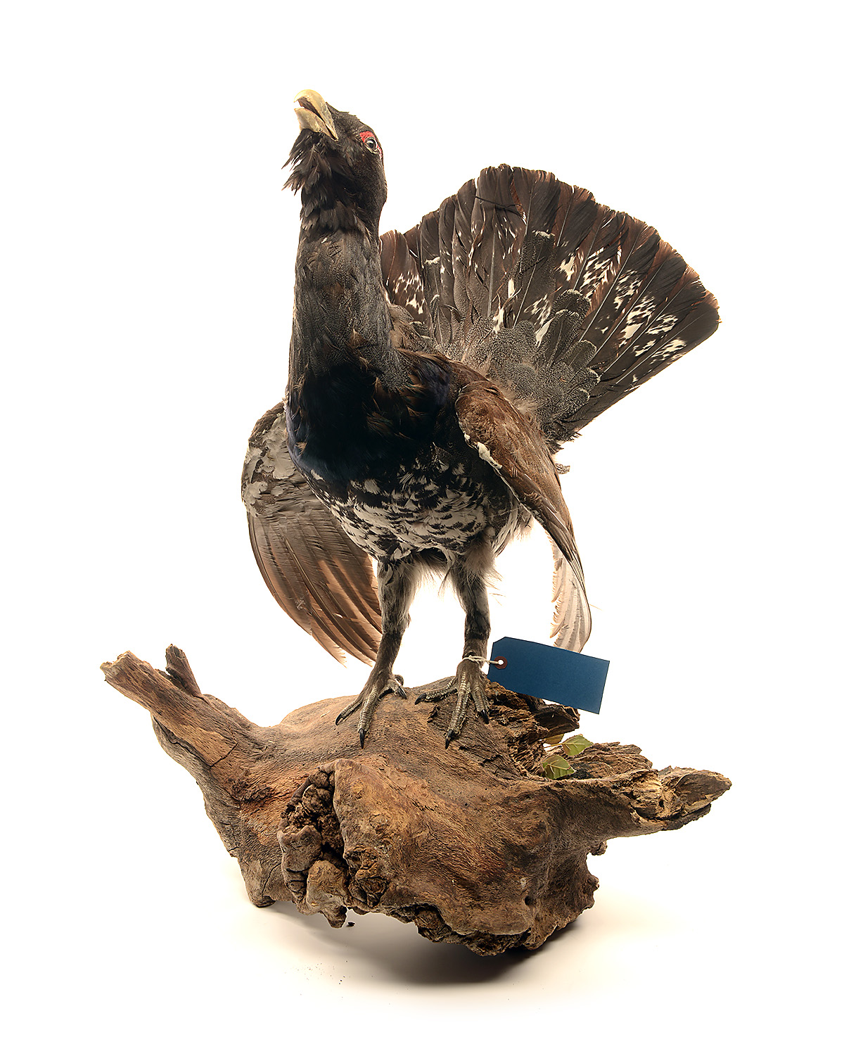A FULL-MOUNT OF A CAPERCAILLIE, mounted of a wooden log, measuring approx. 33in. x 27in. x 20in.