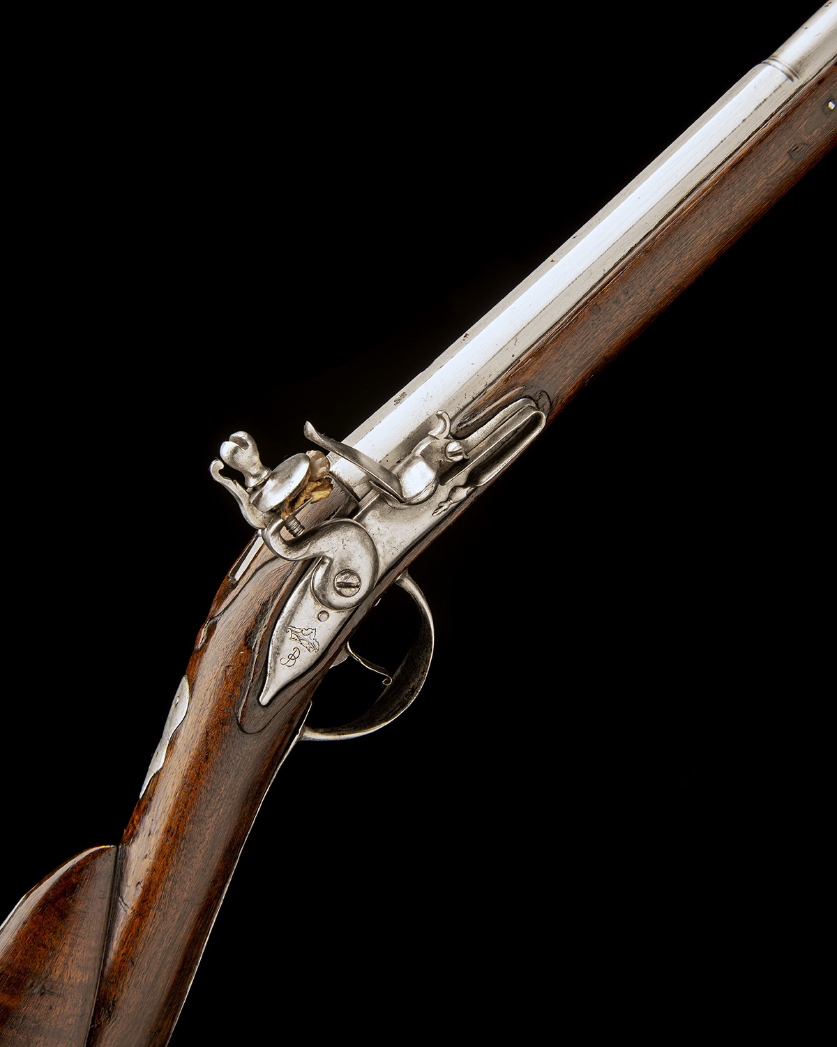 German circa 1730 and probably cut back from a longer musket, with octagonal to round 32in. brushed bright barrel (crack at muzzle), Suhl control marks to underside of breech, curved and radiused plain lock engraved with the letter 'B' for the Dukes of Bavaria, walnut full-stock carved around the ramrod channel and lock and a carved apron around the top-tang, iron furniture including an escutcheon at wrist and a running vine sideplate, oversized heel-plate, the right hand side of butt carved with the letters 'C.T' separated by co-joined reversed letter 'C's, replacement ramrod