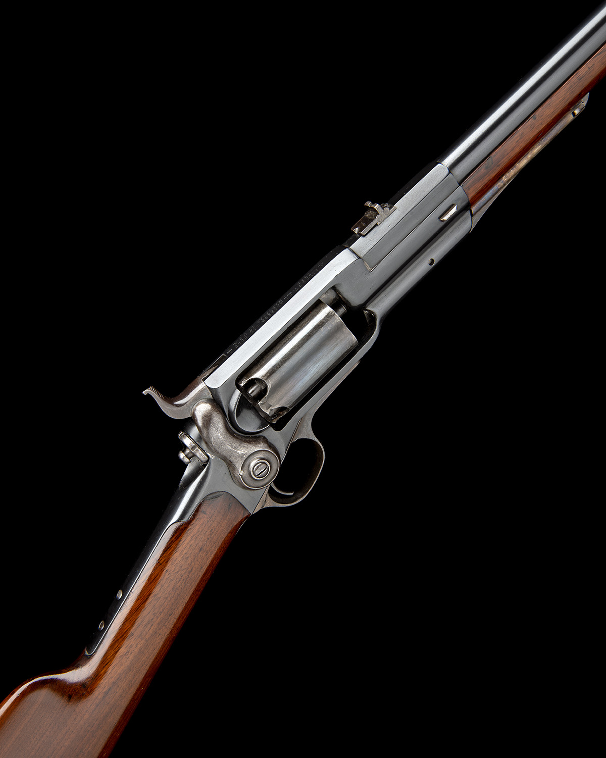 for between 1856-64, with 24in. barrel, dove-tailed blade fore-sight, dove-tailed standing notch rear-sight with provision for two additional folding leaves and marked '100' & '600' (the '300' leaf absent), solid frame, the top-strap re-engraved 'COLT'S PT 1856' and 'ADDRESS COL COLT HARTFORD C.T. U.S.A.', fully fluted cylinder, side-hammer action, walnut butt-stock (old repair at toe), crescent heel-plate with central sliding gate for a cleaning brush (absent), iron trigger-guard bow and tang, walnut full length fore-end with two iron barrel-bands, brass nose-cap, no provision for bayonet, factory sling swivels, articulated loading lever and iron under-barrel button-ended cleaning rod, some refinishing throughout