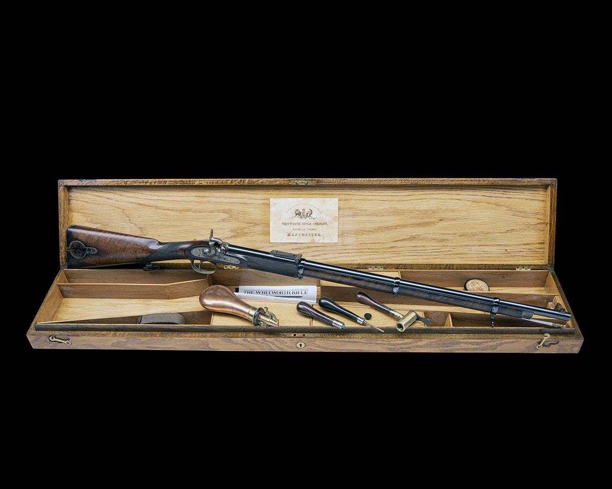 circa 1865, with expertly reblued 33in. barrel signed 'WHITWORTH PATENT' at the breech (refreshed), dove-tailed block with threaded aperture for a windage tunnel fore-sight (absent), broad match ladder rear-sight, renewed colour to the breech block and hammer, traces of renewed colour to the lock and re-signed 'WHITWORTH', sliding safe forwards of the hammer, walnut full-stock chequered at the wrist and fore-end, renewed colour to the heel-plate, patchbox and trigger-guard, three blued barrel-bands and replacement ramrod, complete with an expertly reproduced oak storage case compartmented for this rifle and a reproduction Whitworth flask, a bullet mould calibrated to the rifle by Dyson and a tin of Whitworth style wads