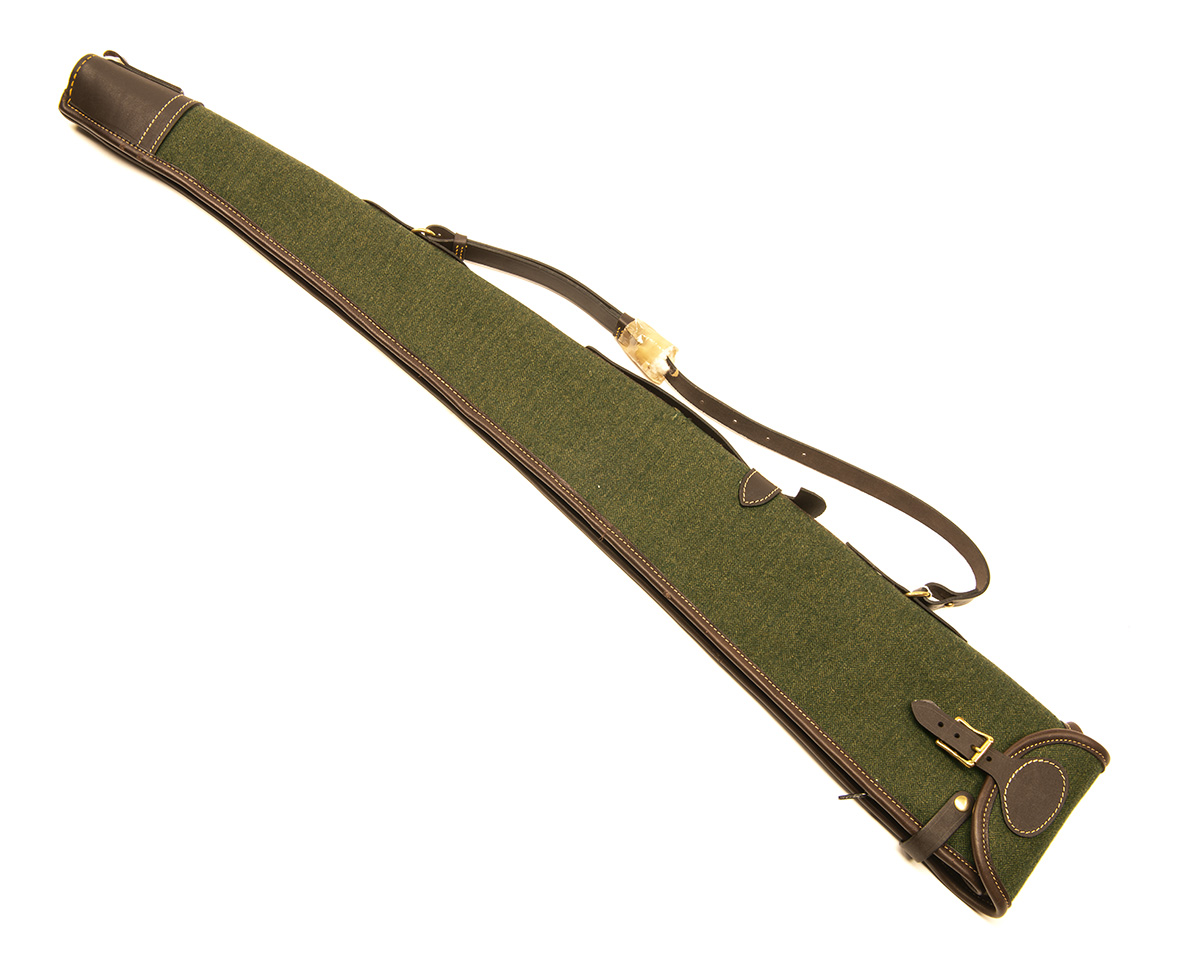 A GREEN TWEED AND LEATHER FLEECE-LINED SINGLE GUNSLIP,