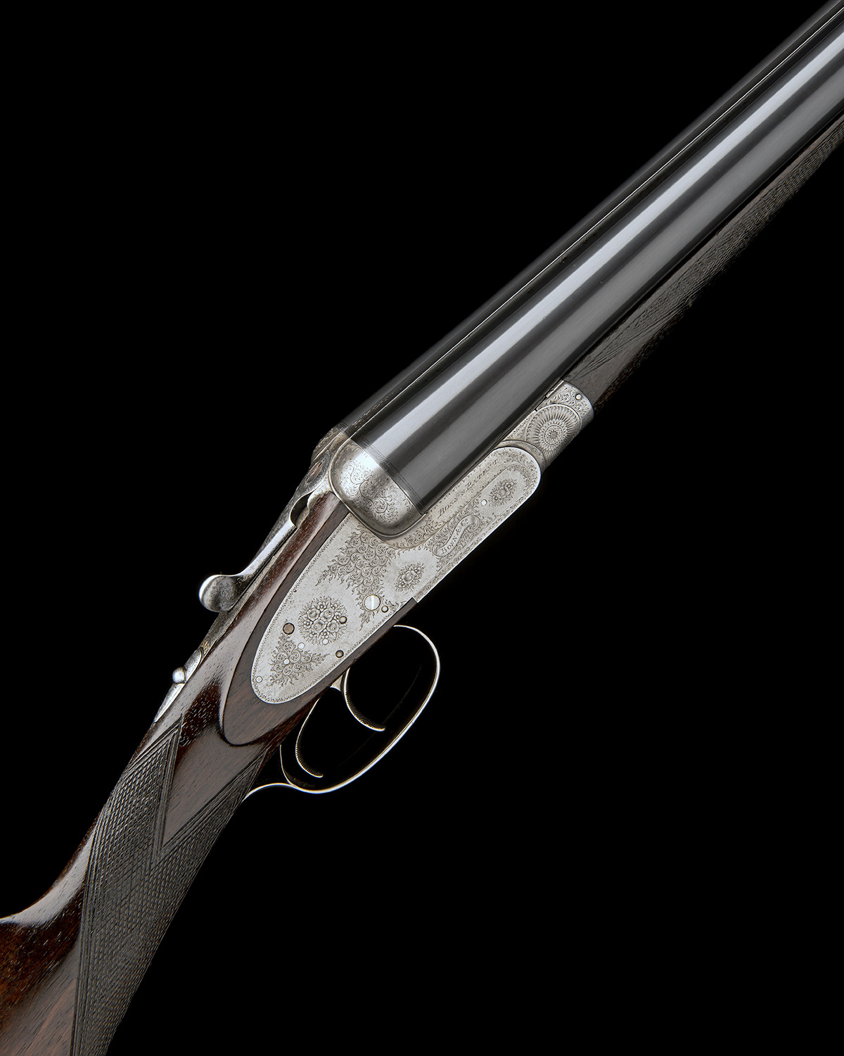 29in. nitro barrels, the rib engraved 'BOSS & CO. 73. ST. JAMES'S STREET. LONDON.' and with acanthus scroll detailing at the breech-end, 2 1/2in. chambers, bored approx. true cyl. choke in both, (loose, right wall at 19+, left wall at 17, some dents and rivels), extra unsigned 26in. nitro barrels by another, the rib engraved with acanthus scroll detailing at the breech-end, 2 1/2in. chambers, bored approx. imp. cyl. and 3/4 choke, (loose), automatic safety with gold-inlaid 'SAFE' detail, gold-inlaid cocking indicators, chequered triggers, rolled-edge triggerguard, best bouquet and partial acanthus scroll engraving, brushed finish, 14in. replacement stock, fore-end wood with losses to leading edges, weight 6lb. 13oz. (29in. barrels), 6lb. 14oz. (26in. barrels), in a brass-cornered oak and leather guncase fitted for the 26in. barrels (would not adapt to 29in.)