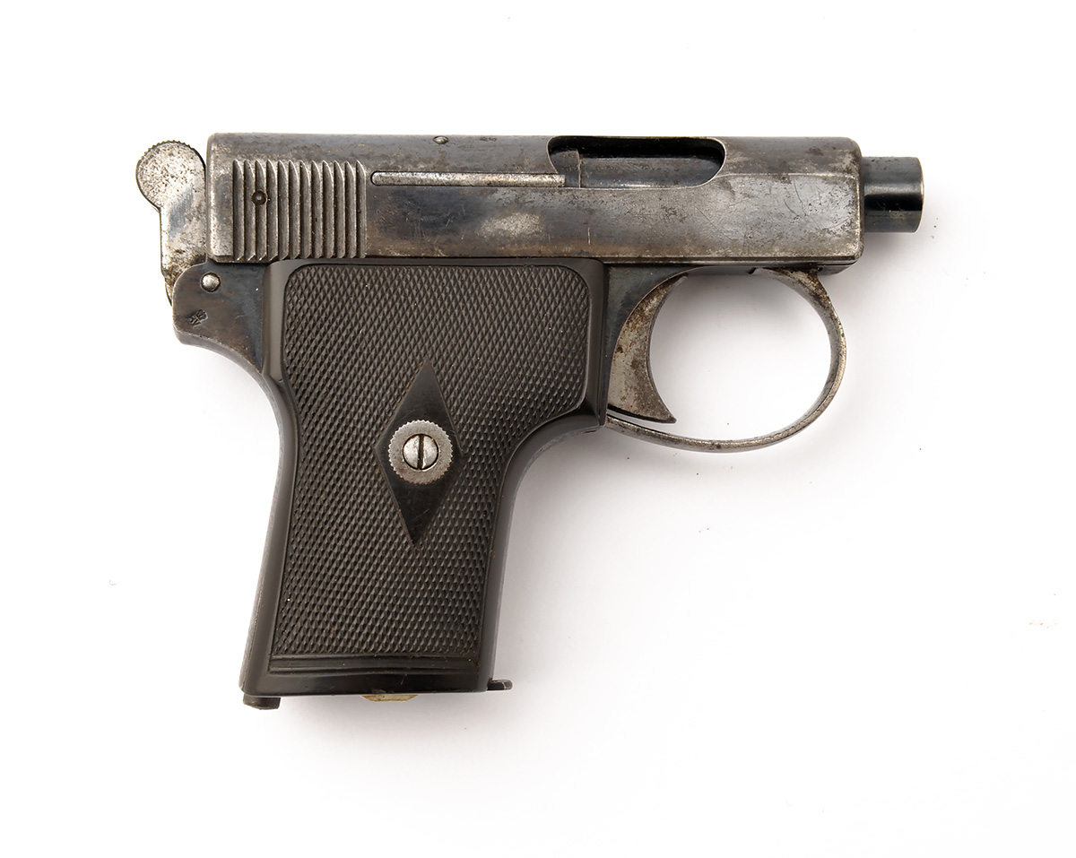 A .25 (ACP) SEMI-AUTOMATIC POCKET-PISTOL SIGNED WEBLEY & SCOTT, MODEL 1907 HAMMER POCKET', serial no. 54668, with 2in. barrel, unsighted slide, blued frame and chequered hard rubber grips