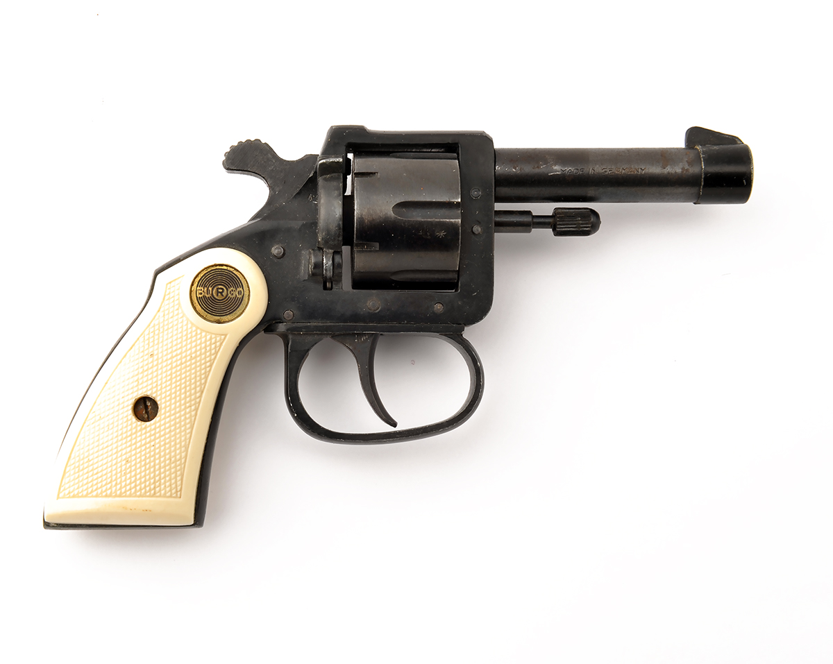 A .22 (L/R) POCKET-REVOLVER SIGNED BURGO, serial no. 44161 , with blued and sighted 2 1/2in. barrel, six-shot cylinder, alloy frame and white plastic chequered grips