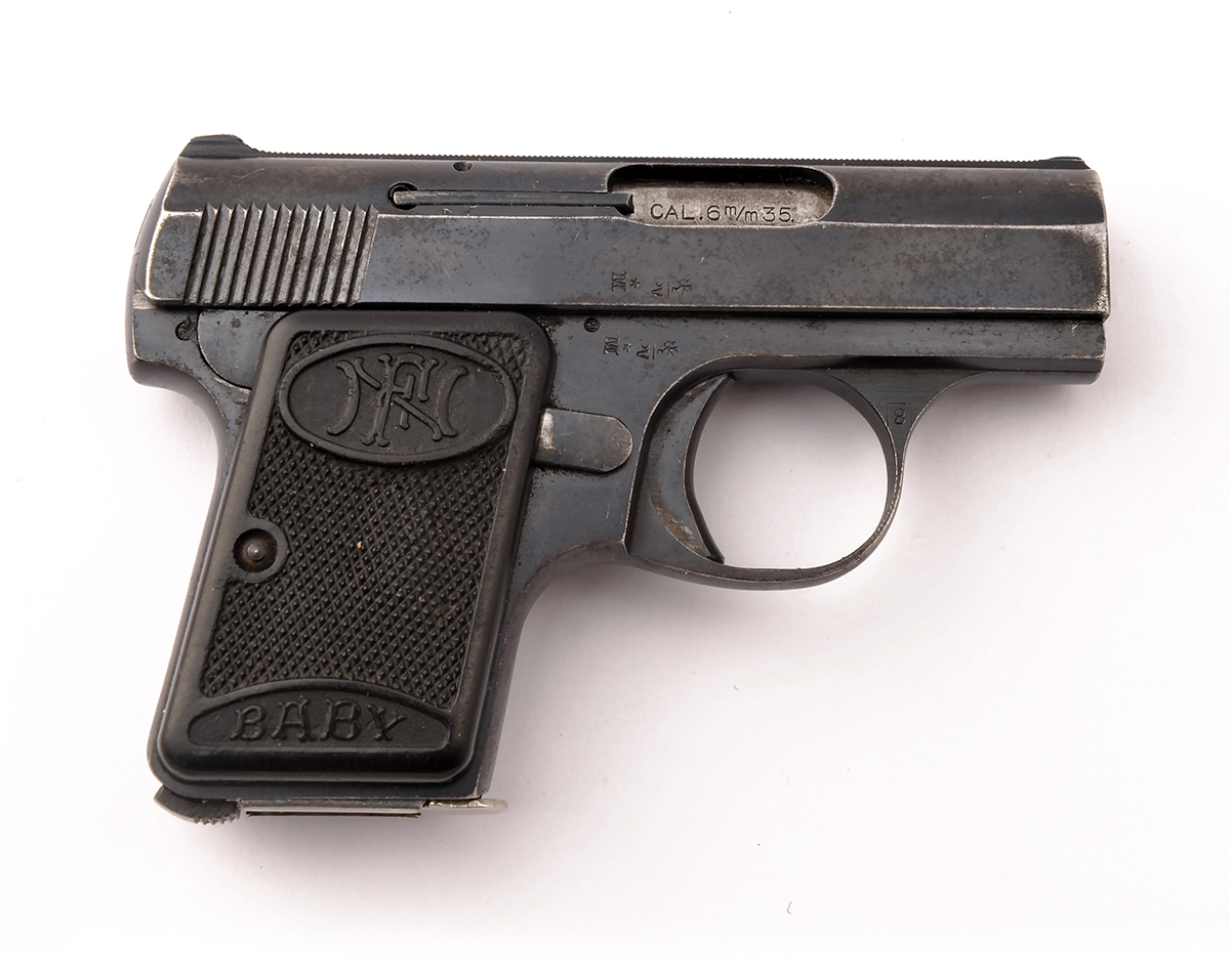 A BOXED .25 (ACP) SEMI-AUTOMATIC POCKET-PISTOL SIGNED FN, MODEL 'BABY BROWNING', serial no. 81777, with 2in. barrel, blued slide and frame and chequered black plastic grips, in its maker's plastic box
