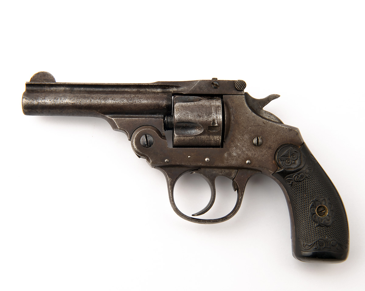 A .32 (S&W) POCKET-REVOLVER SIGNED IVER JOHNSON, serial no. 39261, with 3in. barrel, break-open frame, fluted cylinder and chequered black hard-rubber grips (one badly chipped), retaining some original blued finish